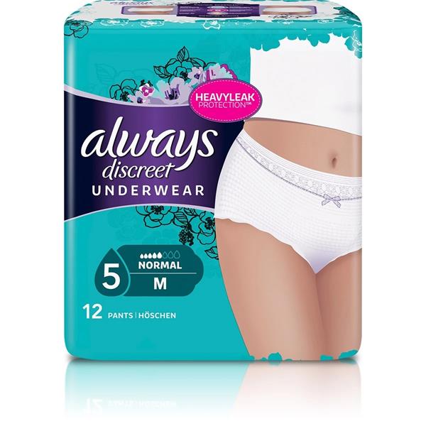 Don'tlet incontinence keep you from being active. With ALWAYS DISCREET Incontinence Underwear Normal Medium you can continue with your day as normal even when you experience large amounts of leakage caused by unintentional frequent urinary leakage from sneezing, coughing and sudden urges, yet need protection that stays in place.