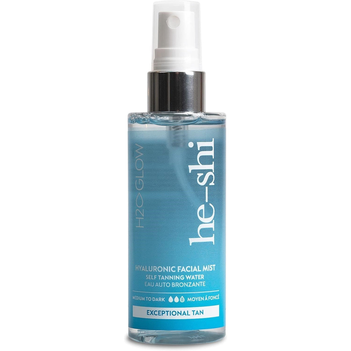 Glow on-the-go with He-Shi H2O Glow Facial Mist 100ml – your hydrating facial tan mist infused with Hyaluronic Acid for a radiant, youthful glow.