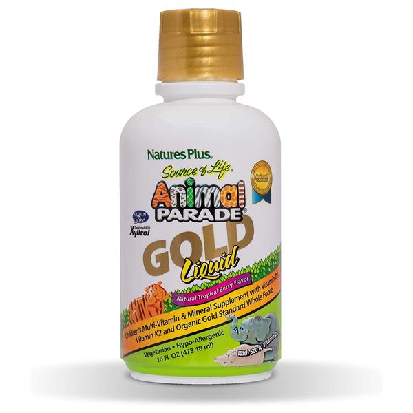 With vitamin d3, vitamin k2, prebiotics and organic gold standard whole foods source of life animal parade gold liquid is a great way to give your kids the nutrition they need and the flavor they crave! the juicy, luscious flavor of original animal parade liquid made a big splash with kids! now kids can ride the irresistibly delicious tidal wave of tropical berry flavor in animal parade gold liquid - the new gold standard in childrens nutrition! animal parade gold liquid takes this best-Selling multi-Vitamin and mineral formula to the next level! bursting with succulent, natural tropical berry flavor, each serving is now packed with 500 iu of vitamin d3, 50% dv of vitamin k2, more trace minerals, prebiotics, and a colorful assortment of organic whole foods. And animal parade gold liquid has 50% less sugar - its sweetened with tooth-Friendly xylitol and only certified organic evaporated cane juice. Animal parade gold is the new gold standard in childrens supplementation. This delicious, unique and highly effective supplement features:Vitamin d3 for optimal bone support and immune system health vitamin k2 for superior immune, blood and bone health more than 15 certified organic whole foods for synergistic health-Promoting activity all essential vitamins and minerals prebiotics to promote a healthy digestive tract lutein for eye and skin protection bioflavonoids for unmatched absorption and activity delicious tropical berry flavor! xylitol , which may reduce the risk of tooth decay 50% less sugar than original animal parade liquidwith so many outstanding features, animal parade gold is the most comprehensive, health-Boosting investment a parent can make. Invest in gold - animal parade gold - for your childrens future.