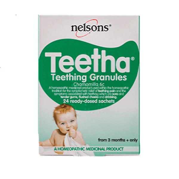 If you are having a sleepless night as a result of a grizzly, teething baby, then why not try nelsons teetha teething granules. Traditionally use: to relieve teething pain. Contains chamomilla 6C. From 3+ months. Convenient, single-Dose sachets easy to use:Quickly dissolving granules