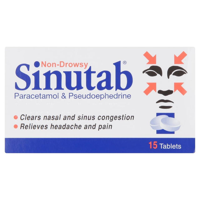 Sinutab Non Drowsy 15 Tablets provide fast, effective relief from nasal and sinus congestion associated with common colds, flu, sinusitis, and allergies. This non-drowsy formula helps to alleviate congestion in the upper respiratory tract, including the nasal mucosa and sinuses, while also easing mild to moderate pain and reducing fever. Ideal for conditions like nasopharyngitis, allergic rhinitis, and vasomotor rhinitis, Sinutab Non Drowsy helps you breathe easier and feel better without causing drowsiness. Available at McGorisks Pharmacy, Sinutab is your go-to solution for congestion relief and symptom management.