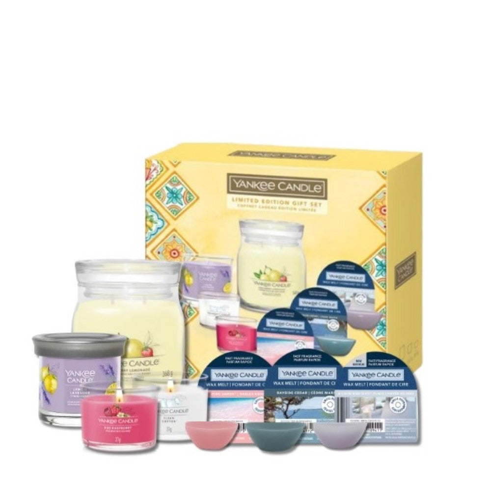 Bring the essence of Spring and Summer into your home with the Yankee Candle Signature WOW Set Spring Summer 2025. This limited edition gift set features the latest Signature range, including a Medium Jar Candle in Iced Berry Lemonade, a Small Tumbler in Lemon Lavender, two Mini Filled Votives (Clean Cotton and Red Raspberry), and three delightful Wax Melts (A Calm and Quiet Place, Pink Sands, Bayside and Cedar).