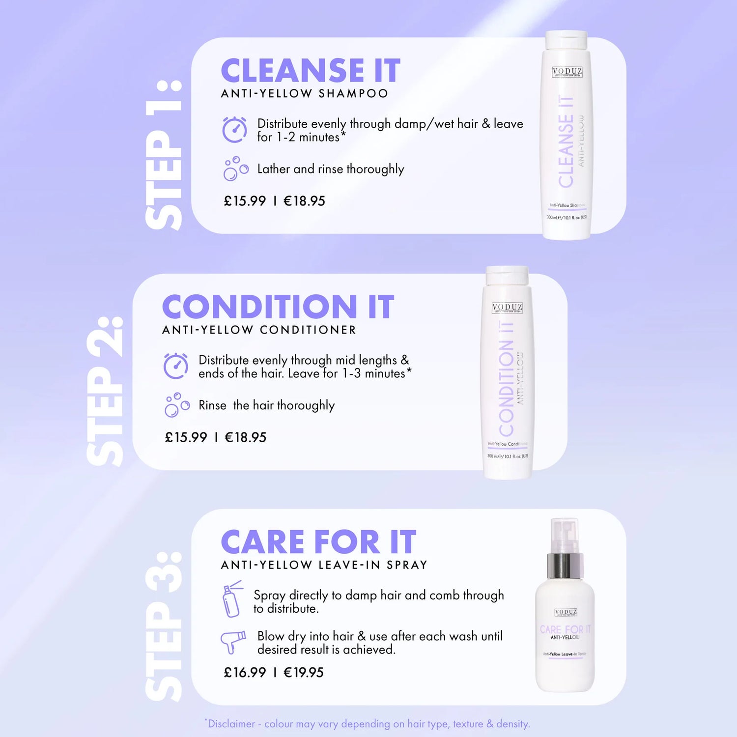 Keep blonde hair bright, fresh and free from brassiness with the Voduz Care For It Anti-Yellow Leave-In Spray. This lightweight, no-rinse formula helps neutralise unwanted yellow tones while detangling, smoothing and protecting the hair from heat and UV damage.